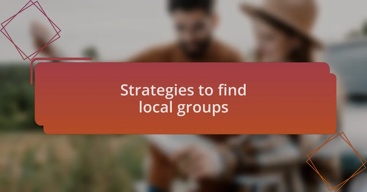 Finding local groups can feel like an adventure, but it starts with doing a bit of research. I often use social media platforms like Facebook or Meetup to explore events happening in my area. It’s incredible how many community gatherings and interest groups pop up when we simply search with local filters. Have you ever stumbled upon a group that immediately sparked your interest? I have, and it’s led to some fantastic friendships.