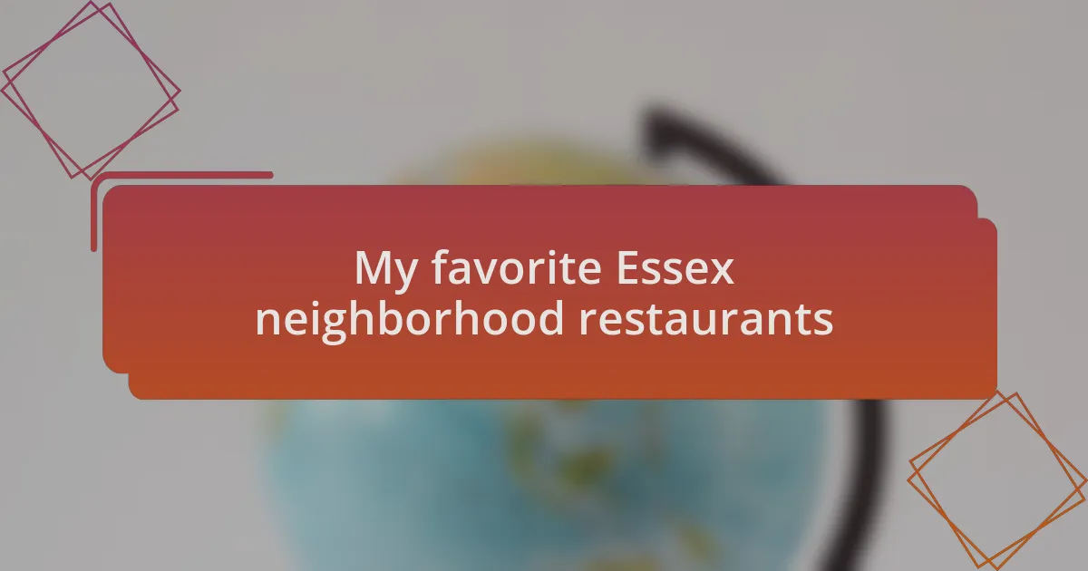 One of my favorite neighborhood restaurants in Essex is a charming tapas bar that never fails to impress. Each plate is like a little work of art, and I love sharing small dishes with friends while we sip on red wine. Have you ever shared a meal where the laughter and flavors blend together? It creates an unforgettable experience, and this place encapsulates that feeling perfectly.